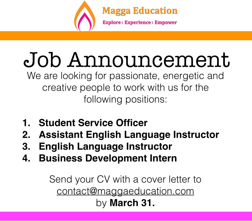 We are looking for passionate, energetic and creative people to work with us. Send your CV with cover letter titled the position you apply for to contact@maggaeducation.com by March 31, 2017. Download job descriptions below: